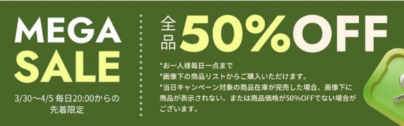 【4/5まで】1人1点 全品50%OFFメガセール開催 毎日20〜24時