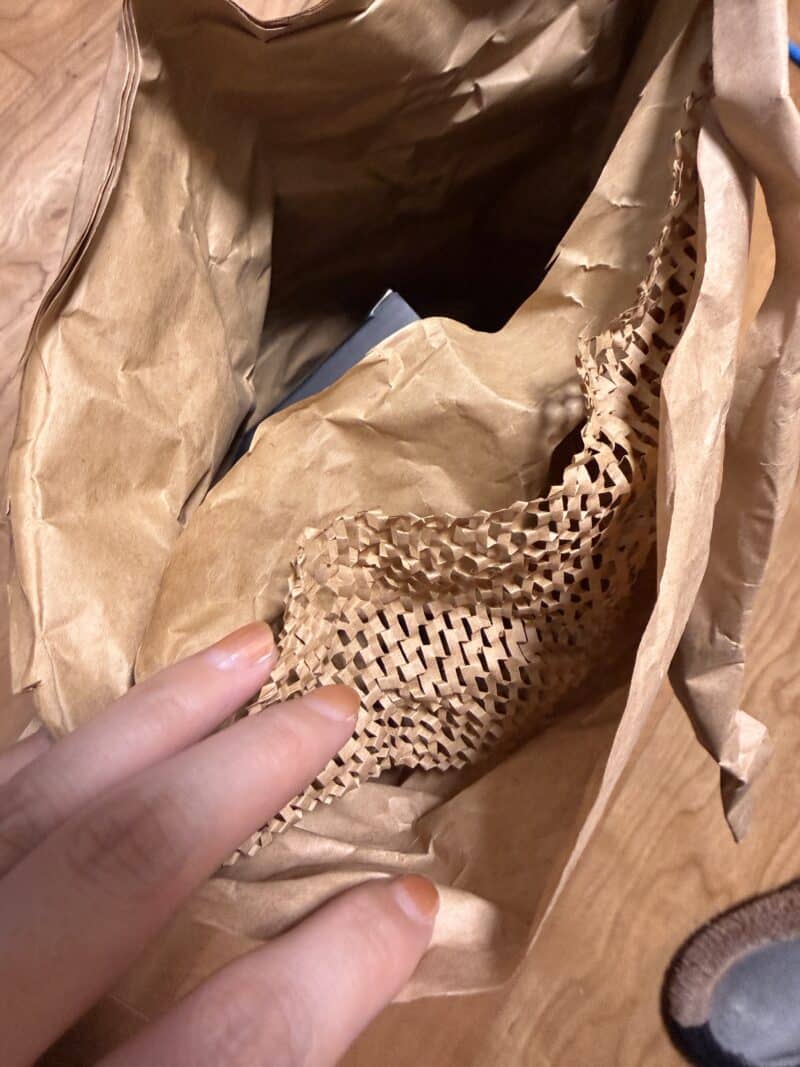 荷物によるかもしれませんが、紙袋のようなものの内側に緩衝材がついている袋で届きます。ペラペラのビニールというわけではないので、海外通販の中では厳重なほうです。