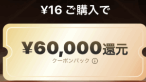SHEINでは、16円以上購入するとクーポンがもらえる「60000円還元」イベントを開催することがあります。本イベントは、専用のイベントページから16円以上購入することで、クーポンセットがもらえるというものです。