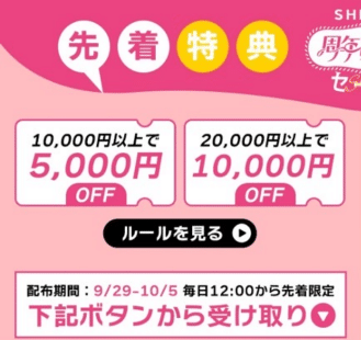 イベント時に先着順限定配布で50%OFFクーポン(または10000円以上の購入で5000円OFFクーポン)が発行されることがあります。SHIENのクーポンで最も割引率が高いクーポンになります。