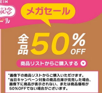 SHEIN(シーイン)では、全品50%OFFになるメガセールを先着限定で実施します。期間は9月29日から10月5日まで開催。現在は終了しています。