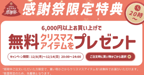 SHEIN(シーイン)では、「SHEIN クリスマス感謝祭」に伴い、6,000円以上購入でクリスマスアイテムが無料で1個もらえるキャンペーンを開催します。期間は12月8日から12月14日の毎日20時から24時。数量限定のため先着順になります。現在は終了しています。