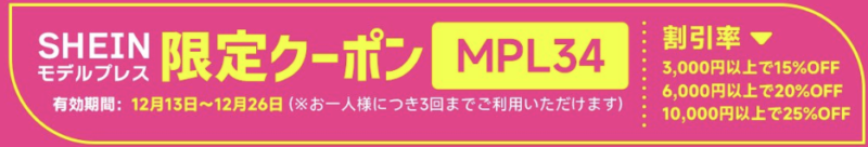 | jpsfyg062002 | 6,000円以上の注文25%OFF 割引上限3,000円 | 取得から24時間 | SHEIN新規会員登録で もらえるクーポン |
