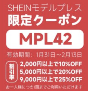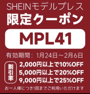 SHEINで今一番おすすめのクーポンコードは条件なしで使える『MPL41』です。9,000円以上25%OFF、5,000円以上20%OFF、2,000円以上10%OFF、使用期限は2月6日。1人3回まで使えます。