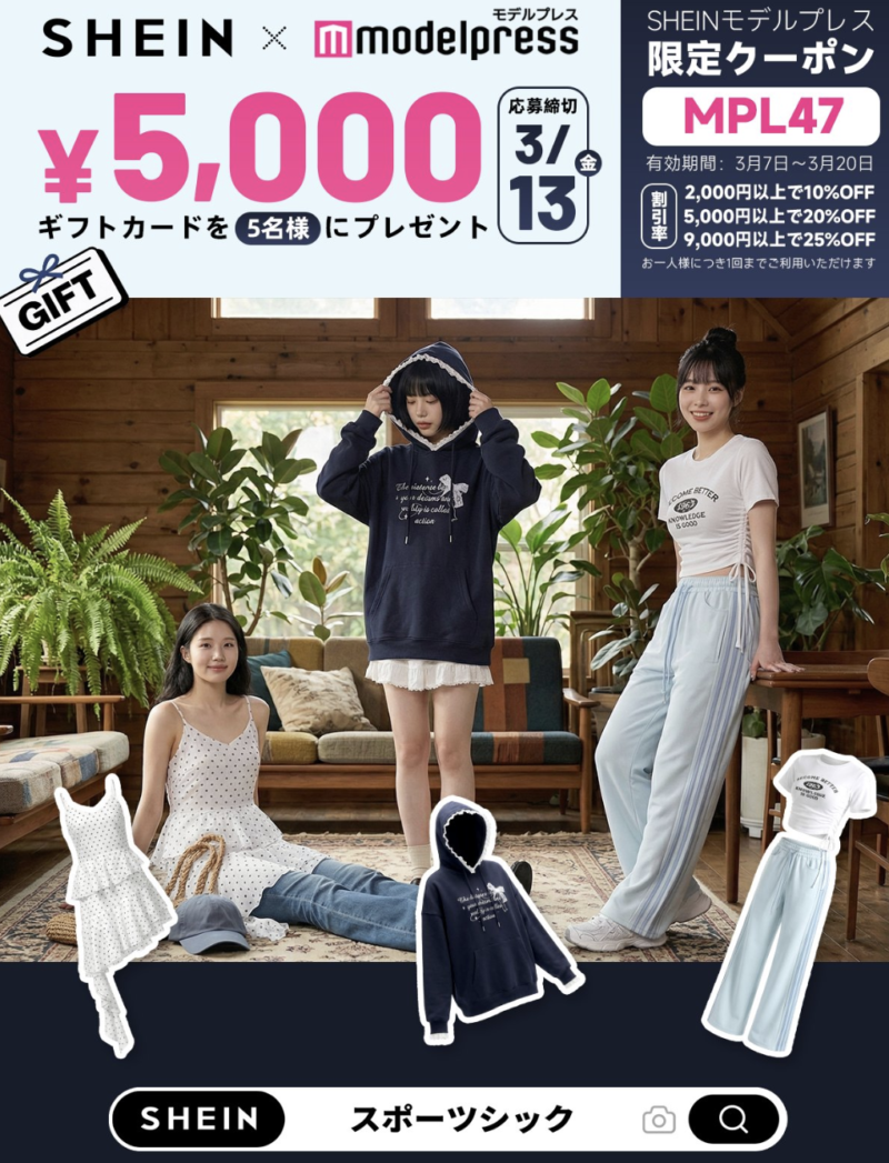SHEIN(シーイン)で条件なしで今すぐ使えるクーポンコード一覧です。割引率は同じなので、3/13までなら「MPL46」それ以降は「MPL47」を使ってください。