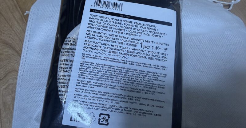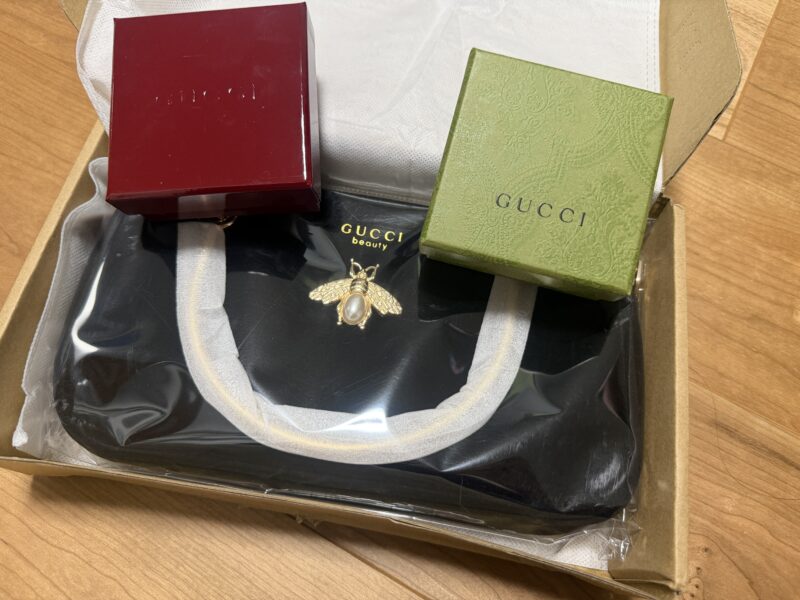 同シリーズのはずのアクセサリーが違う箱に入っています。バッグには化粧品ではないのに「Beauty」の文字。本物にはそんな文字ありませんし、そもそもスエード生地のはずです。