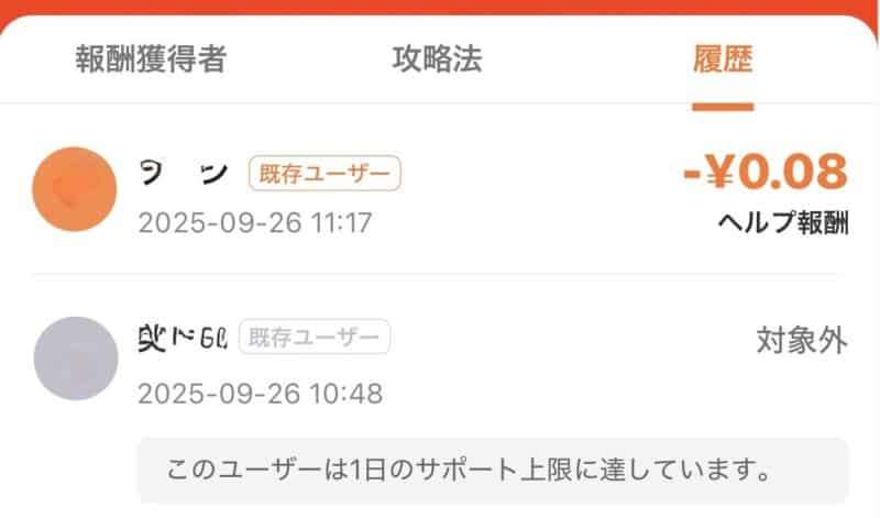 達成はできた…できたけど2週目はもういいかな獲得条件は24時間以内に新規、既存合わせて10人からURL踏んでもらう(またはアプリから紹介コードを検索)事。 ただし、自分が選んだ商品の金額によって許可される既存ユーザー数の上限が変わる。 それを超えると、URLを踏んだ側に「不正なアクティビティが…」みたいなのが出る。 ここが厄介(多分意図的に?)で、エラー内容からだと相手が上限なのか、自分の端末・環境の問題なのか切り分けができない事…なので気づかない人は延々に「踏んだけどエラーが…」「時間置いてやってみます」的な不毛なやりとりが発生して時間切れ起こす…絶対わざとだな