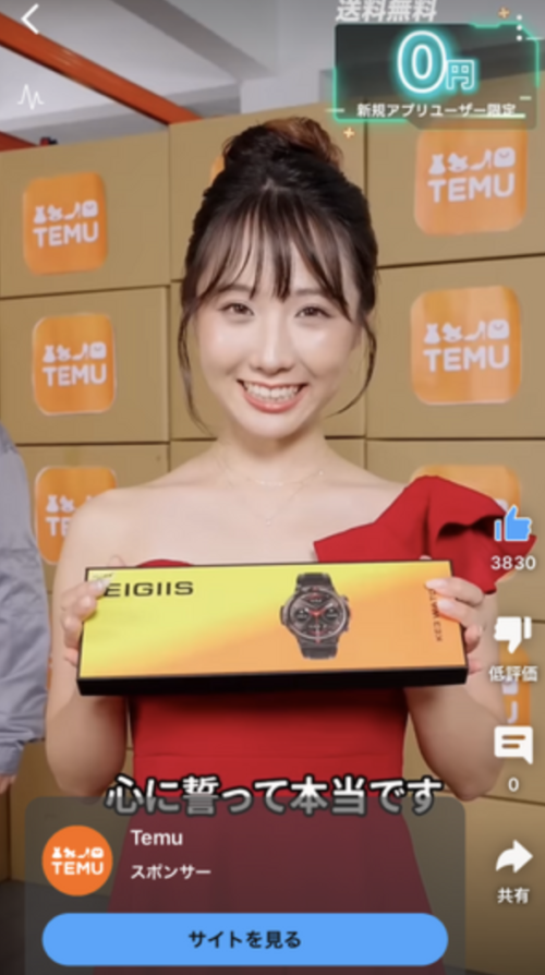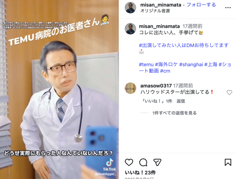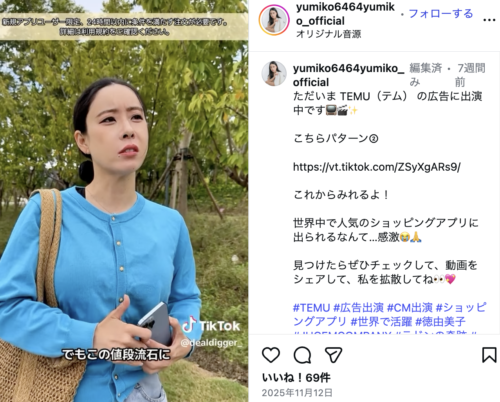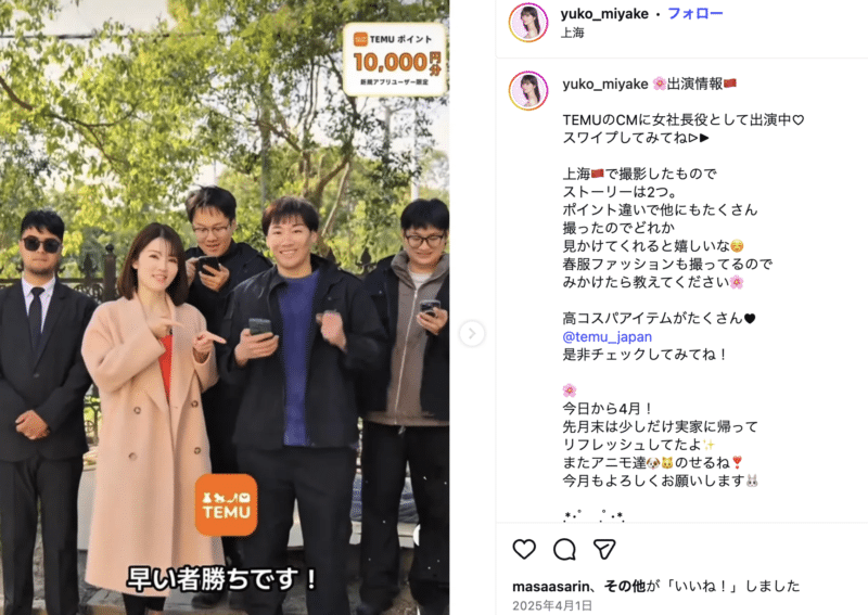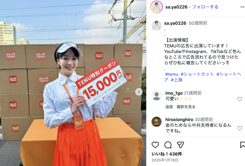 本人のインスタグラムに「TEMUの広告に出演中」と投稿があります。