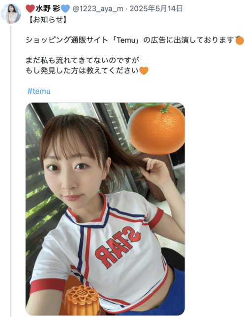 本人のXで「Temuの広告に出演しています」と報告があります。