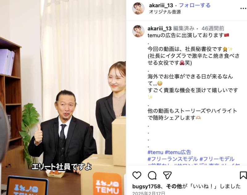 本人のインスタグラムに「Temuの広告に女社長役で登場しました」と投稿があります。